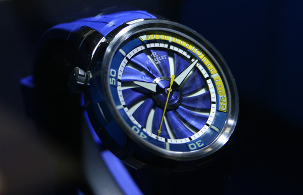 أول ساعة غوص من مجموعة Turbine. مزودة بعلبة من الفولاذ بقياس 47.5 مم مقاومة للماء حتى عمق 300 متر، تأتي ساعة Perrelet Turbine Diver بألوان مناسبة جدًا لاستغلال تأثير التوربين.