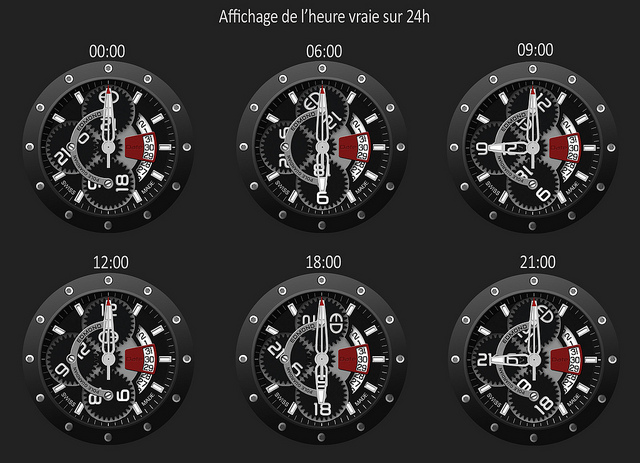 The technology. The standout innovation of this watch lies in its ability to display an ingenious dial capable of showing the time over 24 hours through a very interesting system of rotating discs. This makes it possible to distinguish 6 o’clock from 18 o’clock. It houses an ETA 2824-2 automatic movement (ETA is a Swiss watch movement manufacturer that produces calibres for many watch brands: read our article on ETA watch movements).