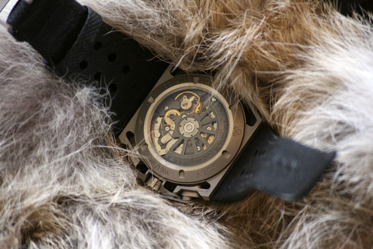 Mechanically, the SpidoSpeed is powered by a Concepto 2251 calibre, chosen for its robustness, particularly well suited to its purpose as a chronograph watch. The “engine” hums along at 28,800 vph and offers a 48-hour power reserve. The movement is easily admired through the sapphire crystal protecting the caseback.