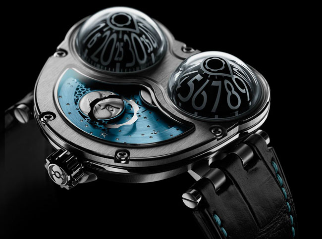 Le designer a eu l’idée simple de faire pivoter une HM3 Frog de 90° et le talent d’ajouter un splendide indicateur de phases de lune au cadran.