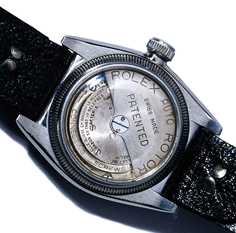 Le fond transparent, probablement en plexiglas, permettait d’observer la masse oscillante marquée « Rolex Auto Rotor », tournant librement dans les deux sens. Ce système exploitait les mouvements du poignet pour armer la montre en continu, sans remontage manuel.